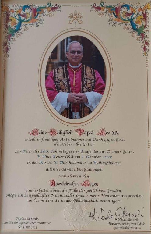 In der Taufkirche begrüßte Pfarrer Dr. Eugen Daigeler herzlich den Weihbischof und einen Mitbruder aus dem Kloster von P. Pius, P. Wilfried Balling aus Münnerstadt. Zuvor hatte eine neu gegründete Frauenschola unter der Leitung von Kerstin Sauer den Festgottesdienst eröffnet. Der Pfarrer verlas auch einen besonderen Brief, mit dem Papst Leo XIV. den versammelten Gläubigen den Apostolischen Segen erteilte. Der Heilige Vater ist selbst Mitglied des Augustinerordens wie P. Pius.